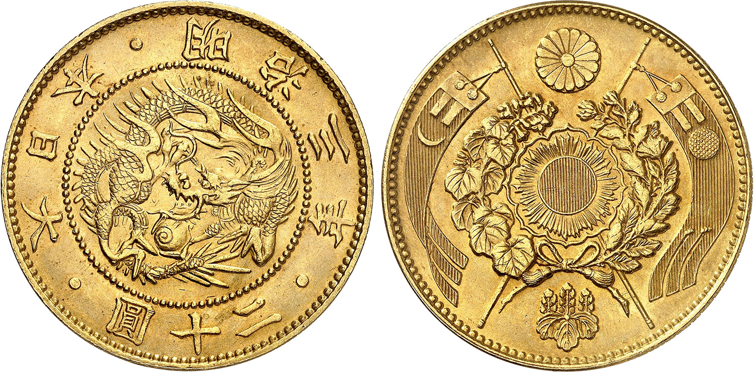 In 1869, the Japanese government decided to abandon the old currency hotchpotch in favor of a single national currency. What this means is illustrated by a survey of the Japanese Ministry of Economy of 1868: it found that between 1603 and 1867, a total of 1,694 different denominations had been issued and were still circulating. They were all to be replaced with new western-style coins based on the decimal system. They were called “yen” due to the circular shape of the coin. “Yen” simply means “circle” or “round”. Three important Japanese artists created the design for the new single currency: it depicts a dragon on the obverse and the sun on the reverse as a reference to the Japanese Tenno – the emperor was considered to be the descendant of both Amaterasu, the sun goddess, and Watatsumi, the dragon god. This design was sent to the Royal Mint in London, where Leonard Charles Wyon created dies for eight denominations. This resulted in patterns created by the Royal Mint, probably in the hope of winning Japan as a customer. But when the patterns arrived in Japan in April 1870, the mint in Osaka was already well-equipped to mint their own coins. Was it a matter of national honor not to adopt the British design but to modify it? Anyway, the reverse was extensively revised and an additional denomination was created: the golden 20 yen piece.