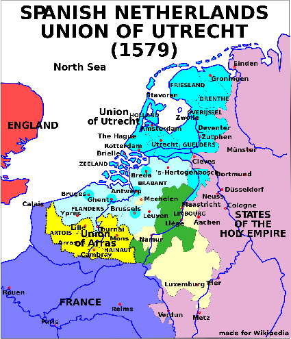 By this point, Alexander Farnese probably could have returned the Netherlands to Spanish command entirely, if it had not been for further international developments: it was now the English Queen Elizabeth I. who intervened. Philipp II.’s attempt to prevent her from any other intervention by sending out his Spanish armada failed miserably. Alexander Farnese was withdrawn from the Netherlands in order to come to France’s aid in preventing the Huguenot Henry IV. from inheriting the French throne. These circumstances allowed the States General to reorganize themselves while their greatest adversary Alexander Farnese invaded Paris and later died in Arras in 1592. His successors were not of the same caliber. They came and they left, until the Eighty Years’ War ended with the Peace of Westphalia and the subsequent international recognition of the Republic of the United Netherlands in 1648.
