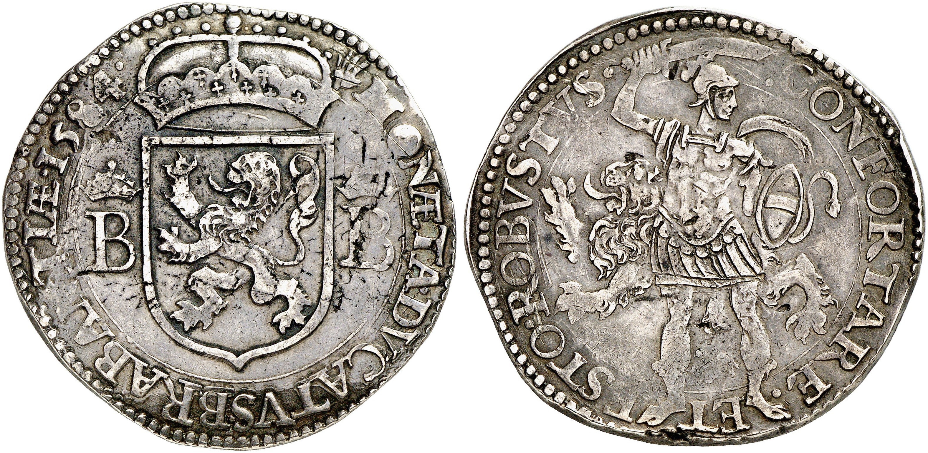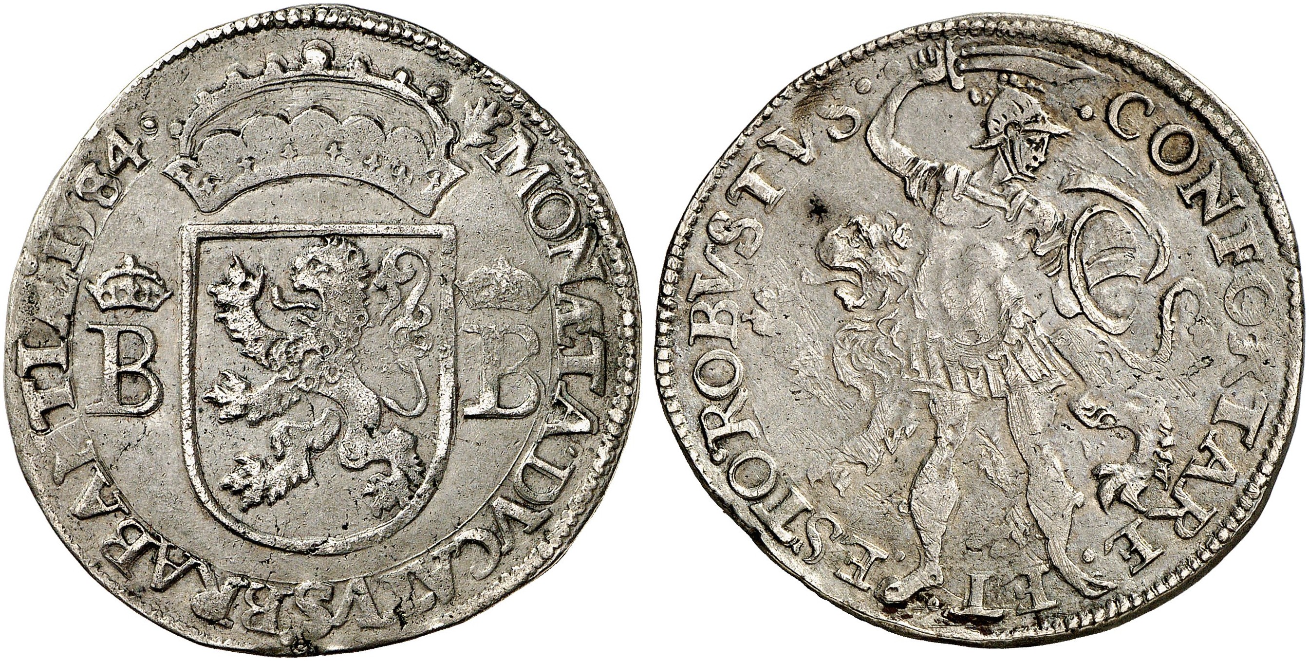 When said 10,000 soldiers finally arrived, it became apparent that Francis of Alençon did not primarily have the Netherland’s wellbeing in mind, either. He wanted to rule and thus attempted to seize control of the allied town of Antwerp. The Antwerpians had been warned in advance and, much to their surprise, massacred the invading French soldiers. Francis returned to France – and Antwerp celebrated the independent Republic of Brabant on their coins. In accordance with their legend they are denoted as ‘Robustus Daalder’. The quote found on this thaler was taken from the Book of Joshua and can be translated as “Be strong and brave”. A total of 34,715 of these thalers were produced between September 1584 and June 1585.