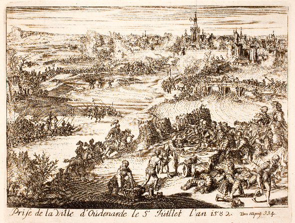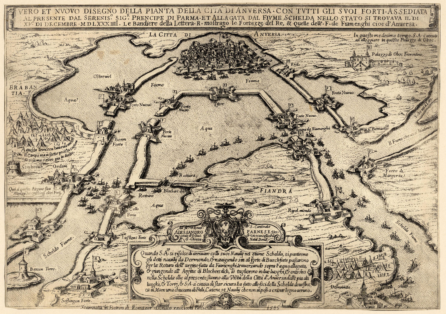 Here his engineers produced their masterpiece. In order to completely invest the town located at the river Scheldt, they built a pontoon bridge which neither the usual flooding nor incendiaries could demolish. The citizens of Antwerp surrendered on August 17th, 1585.