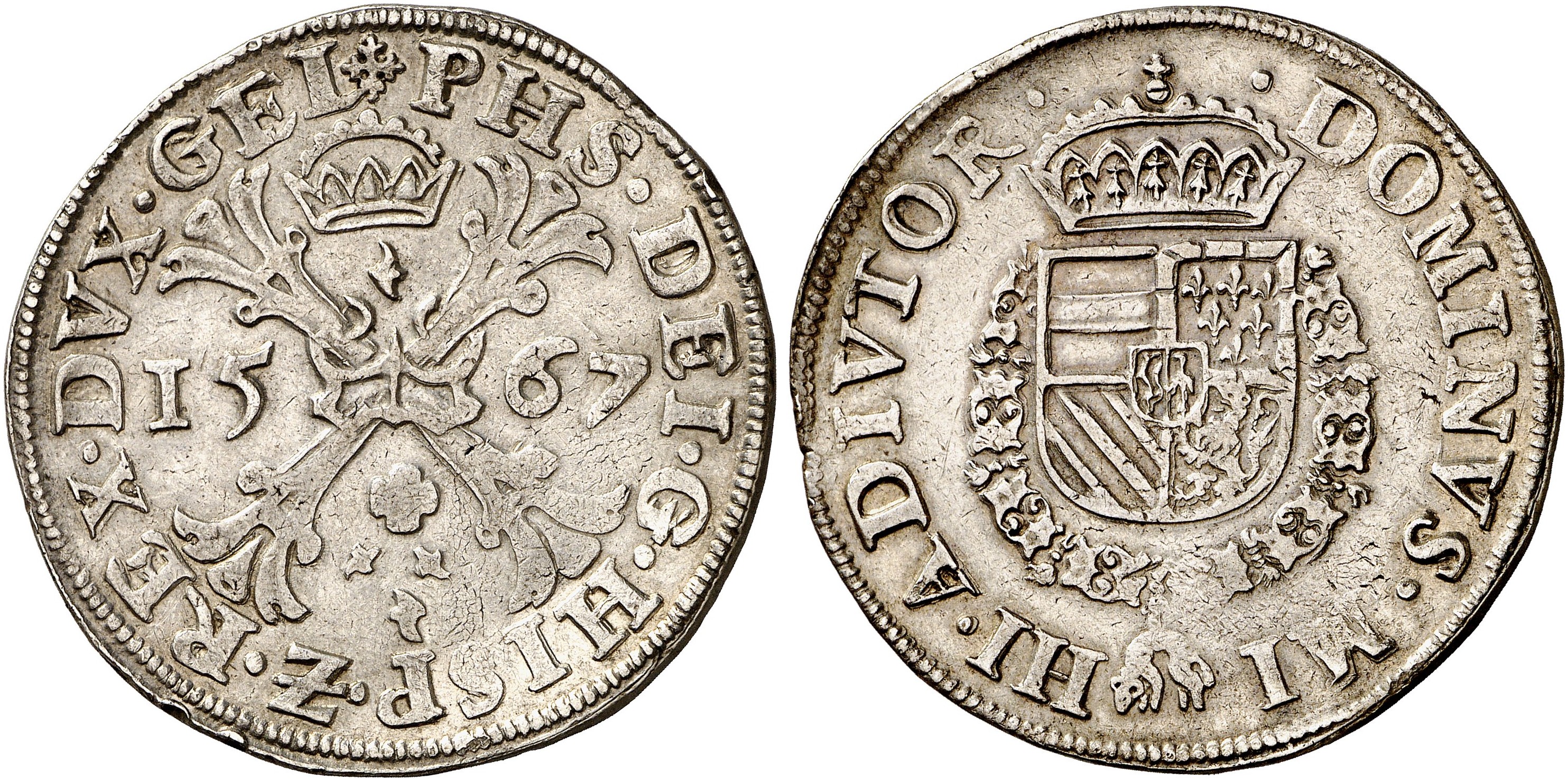 Along with the thalers bearing the effigy of the monarch, the Spanish likewise issued coins which showed the Burgundian cross on the obverse and the Order of the Golden Fleece on the reverse. After all, the Netherlands had traditionally been part of the Burgundian kingdom. The Burgundian rijksdaalder were a little bit lighter than the philipsdaalder and mentioned their minting authority only in the legend. On this coin from the Duchy of Guelders, Philipp is addressed as Duke of Guelders correspondingly.