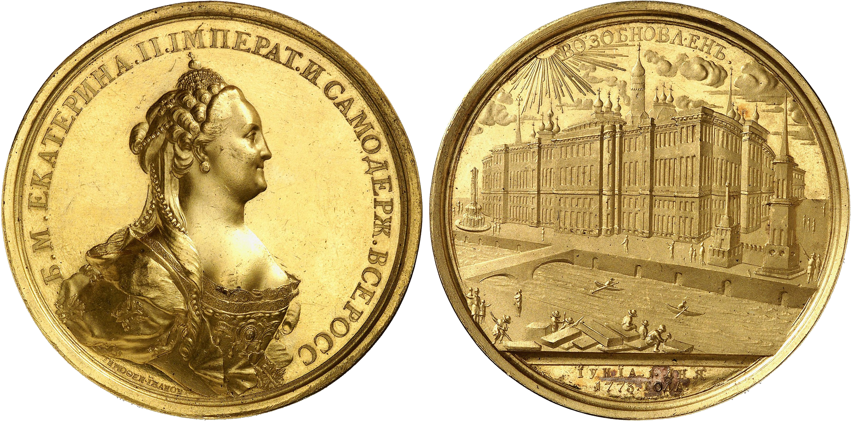 It was that very model which was transferred to Saint Petersburg on 120 sledges in 1772. Catherine looked it over, gave permission and on 1 June 1773, the cornerstone ceremony was held. The latter is commemorated by the very rare gold medal offered at Künker’s. It shows the building, which at the time was still in planning and only existed as a model, already fully completed. Catherine paid for 20 buckets of vodka and 40 buckets of beer, which were distributed among the builders on the occasion. The empress herself, however, did not attend the ceremony, because resistance was growing against the irreverent demolition of the Kreml. Even the loyal poet of the court, Gavriil Derzhavin, condemned Catherine’s handling of the Russian past, and on top of that, cracks began to show in the walls of the Cathedral of the Archangel, which housed the graves of almost all Russian tsars before Peter the Great. As a consequence, Catherine the Great had the construction works stopped immediately. She claimed the geological conditions did not allow for buildings this size. The real reason may well have been a different one: Catherine was not willing to finance a project in a city she despised, which, due to the architect’s megalomania, was bound to become a bottomless pit. For Bazhenov was already talking about building three giant avenues leading from the Kremlin through Moscow, in order to modernize the entire city. All that never came to be executed. Instead, when she returned to Moscow in 1775, Catherine lived modestly and comfortably not in the Kremlin, but in three spacious houses provided by the Golitsyn and Dolgorukov families.