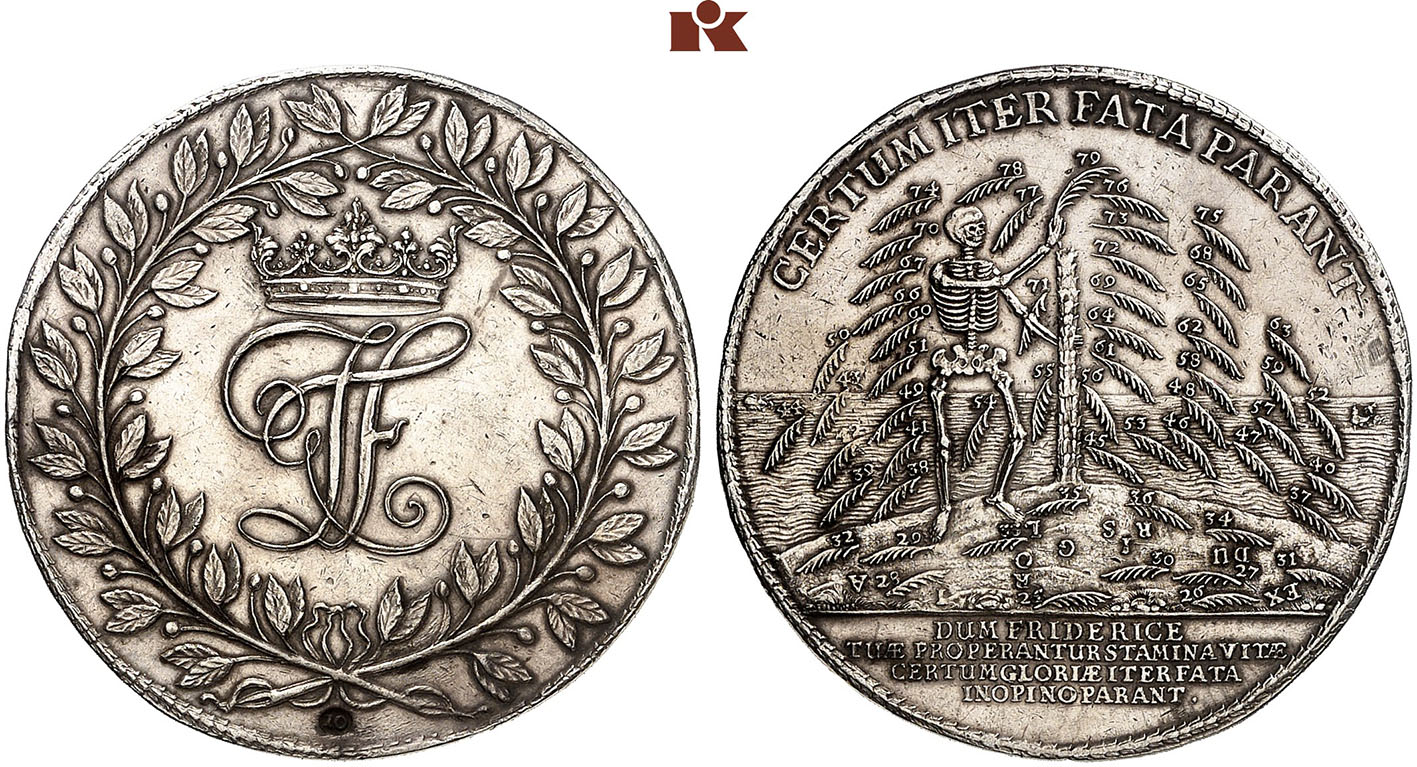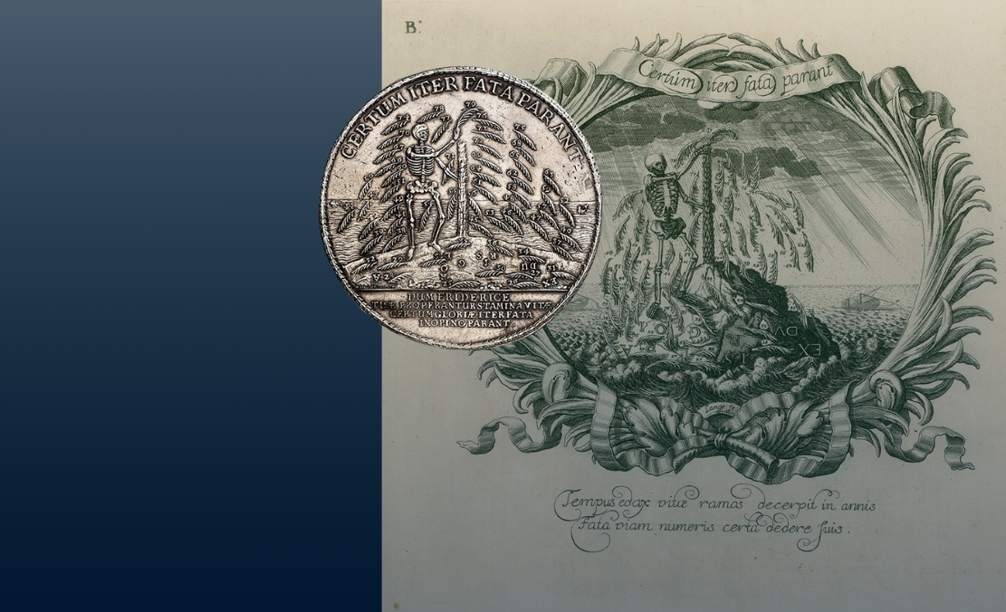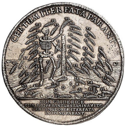 Our löser issued on the occasion of John Frederick’s death is variegating these elements, too. The palm tree is turned into a tree of life, which Death tears apart piece by piece. The translation of the inscription reads as follows: A safe path is provided by the divine will. And in the exergue: While your thread of life is hastily unwound, Frederick, fate unexpectedly paves a safe path to glory.