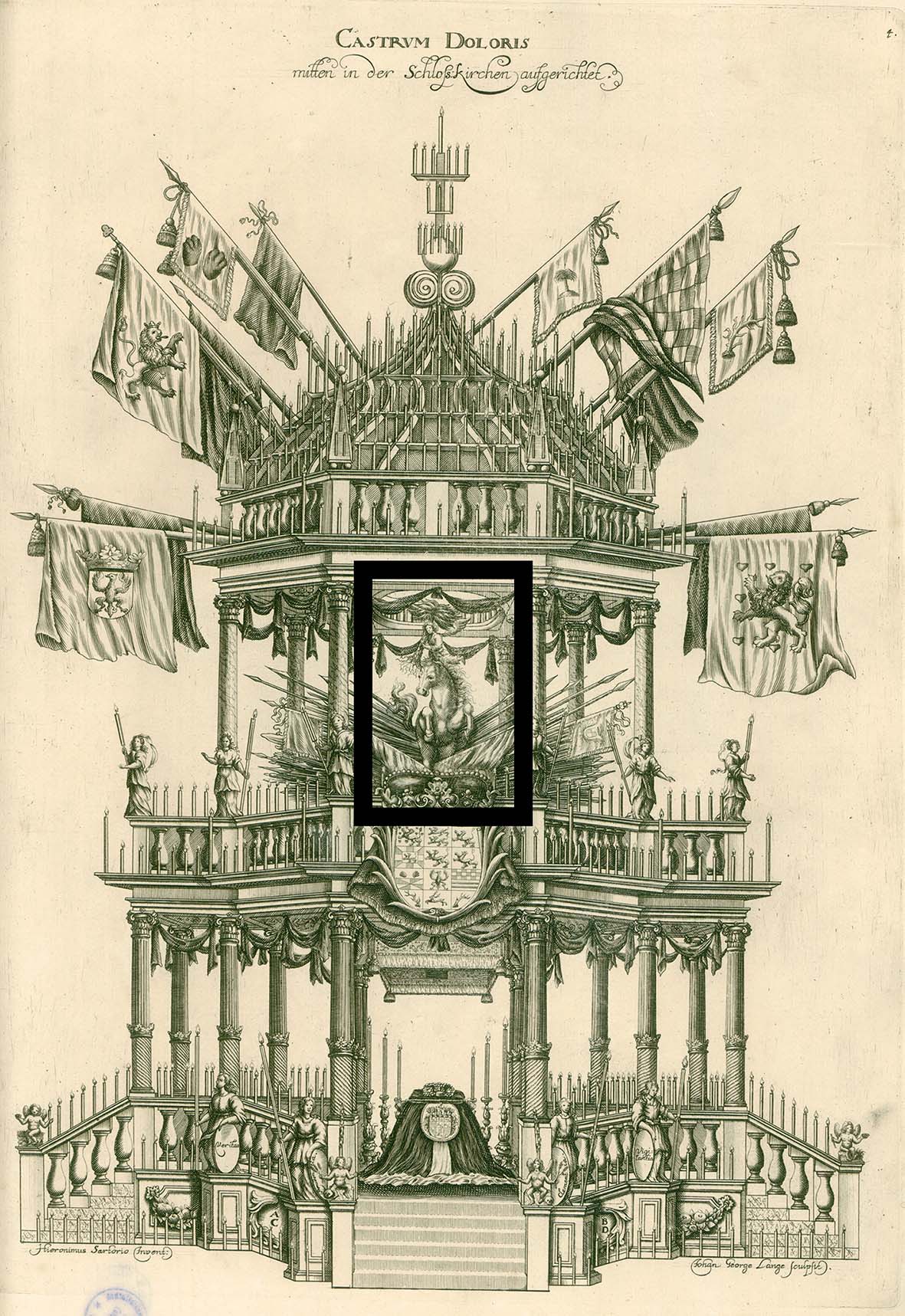 The castrum doloris also served the purpose of reminding those present of the deceased once more. Therefore, above the catafalque we can see the leaping horse of the House of Welf, a genius sitting on it, carrying the dug out palm tree with roots in his hands.