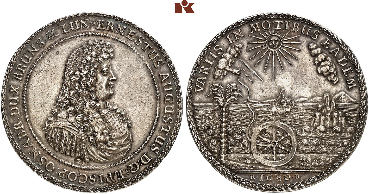 This löser of two reichstalers issued by John Frederick’s successor on the occasion of his accession to power struck at the same time as the funeral löser we are presenting here plays with the images of his predecessor, too, and thus tied in with John Frederick’s successful reign. Ernest Augustus “quotes” the palm tree, the island and the ship. The motto, which could be loosely translated as “The same under different circumstances” probably refers to his elevation in status. The image uses the palm tree as a symbol for the hard work it takes to navigate the ship - of the state? of life? - across the storm-tossed and sunlit sea, past the steep cliffs of the island into the harbour. The wheel - the coat of arms of Osnabrück, where Ernest Augustus served as bishop, and at the same time an allusion to fate - is in God’s hands. Ambiguous emblems that posed a riddle for the educated class were very popular at the time.