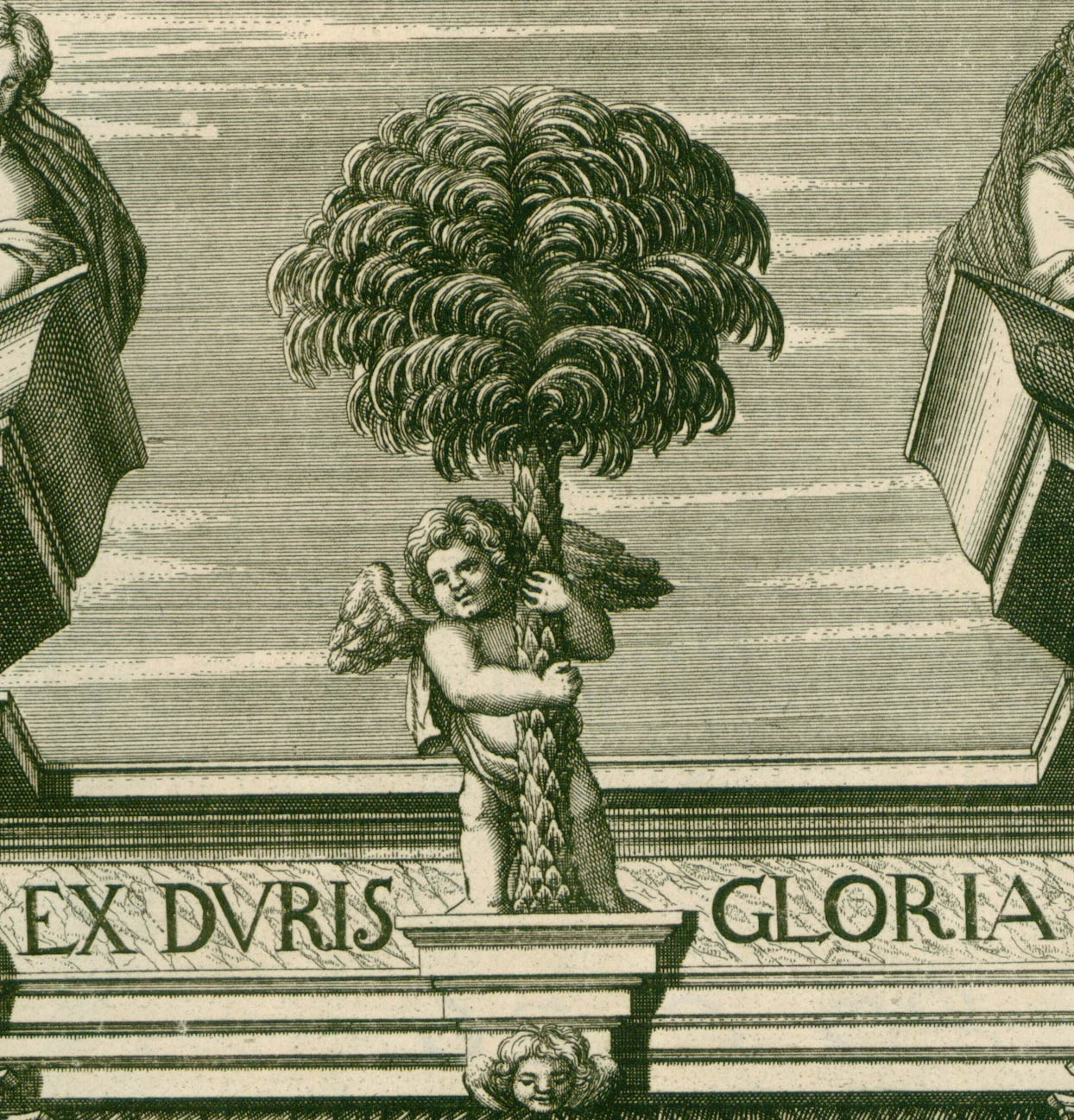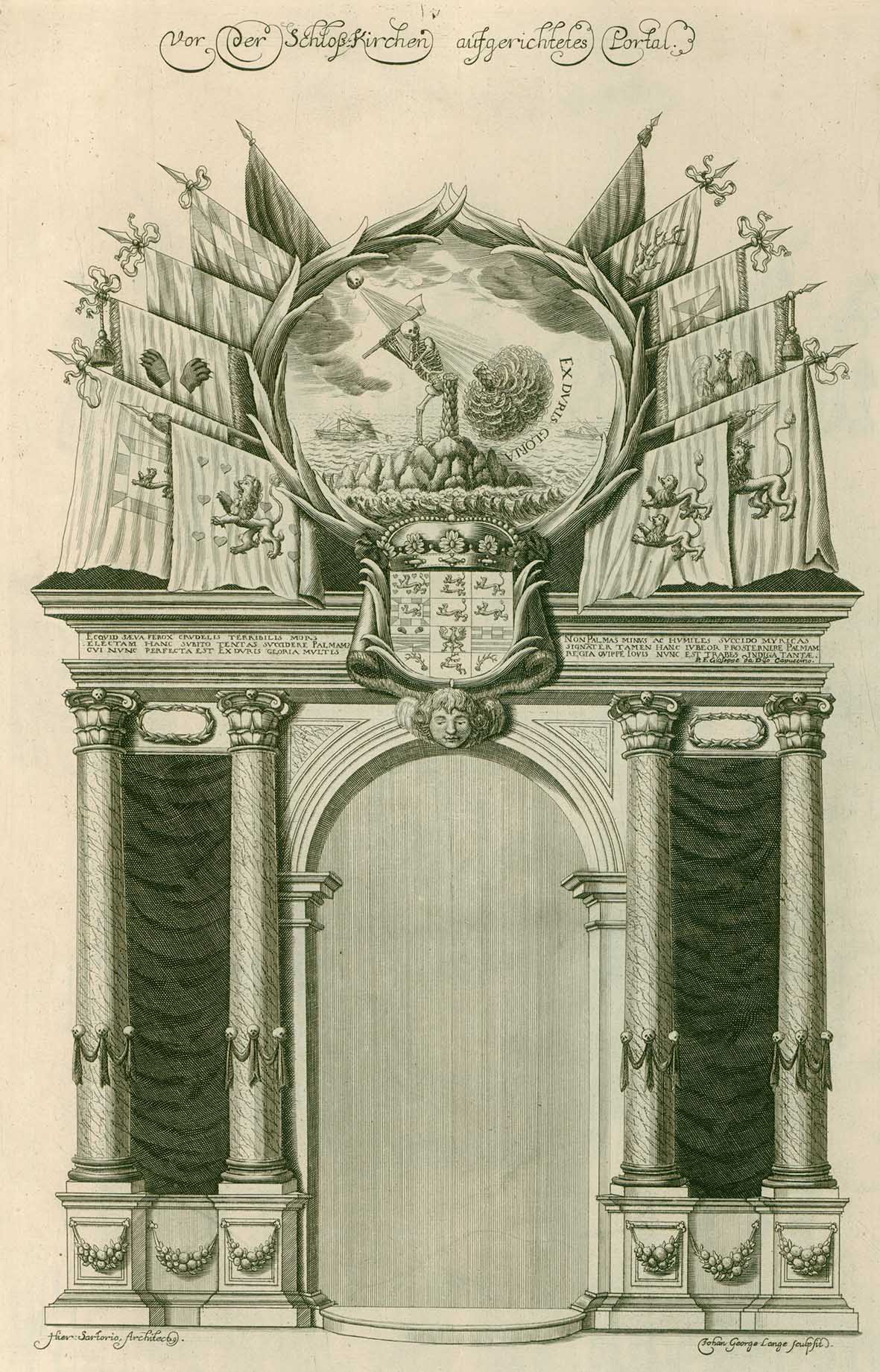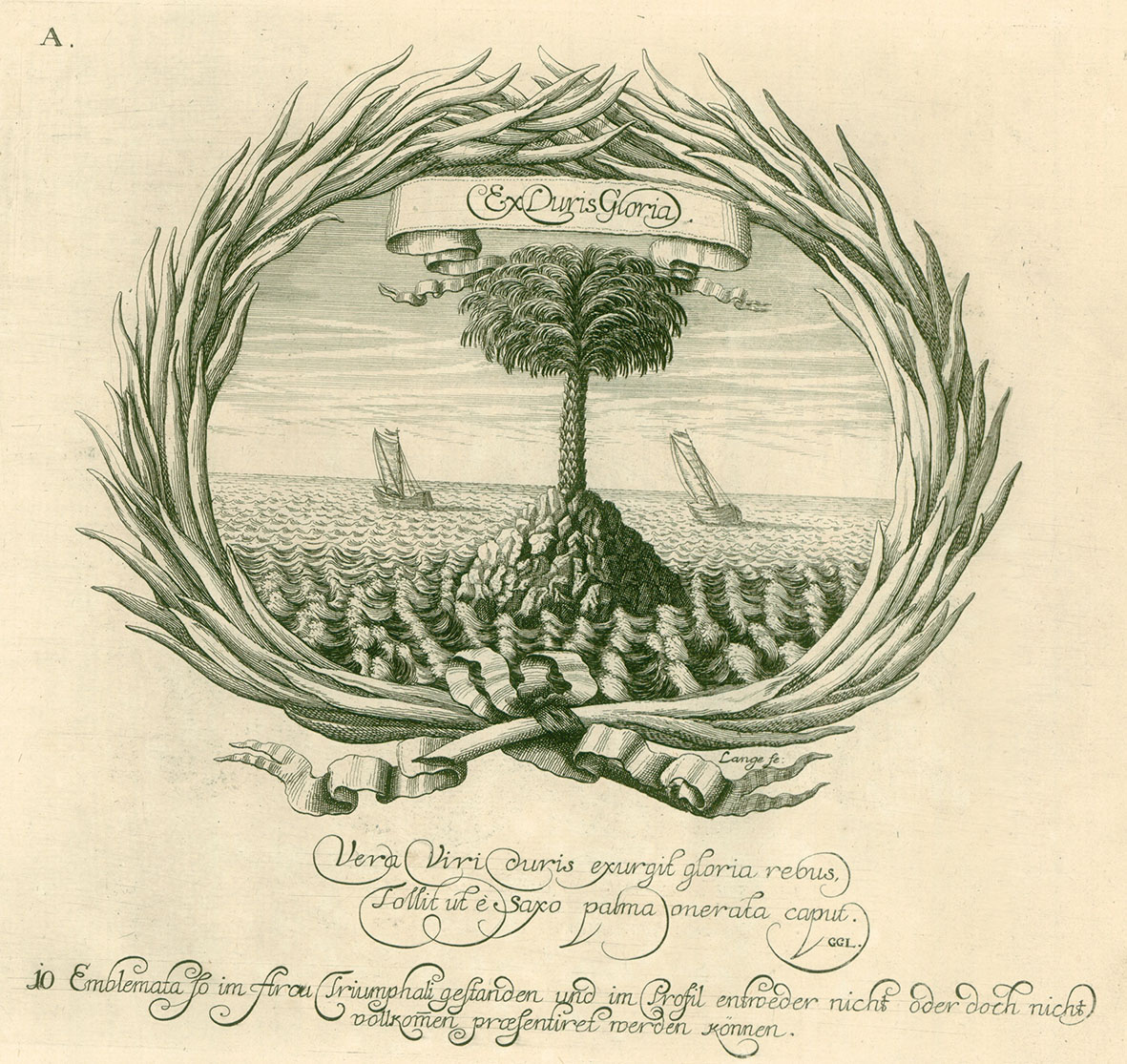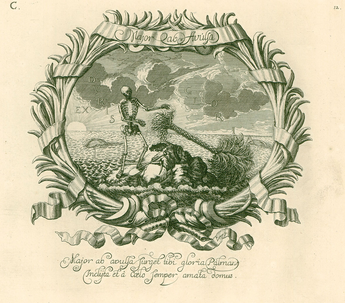 Another emblem depicted on the gate shows a slightly different image: With pick and spade, Death digs out the palm tree together with the roots. The ships capsized. The motto EX DVRIS GLORIA ascends up to heaven.