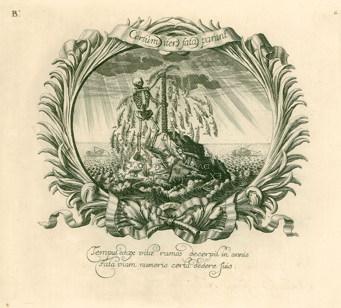 Every single branch that was torn off the palm tree has a number. David Samuel von Madai explained in his taler catalogue of 1766 (Vollständiges Thaler-Cabinet) that the numbers refer to the years of the ruler’s life. At the very bottom we can see a branch marked with the number [16]25, i.e. the year in which John Frederick was born. The branch that Death tears off last bears the number [16]79, i.e. the year of the prince’s death.