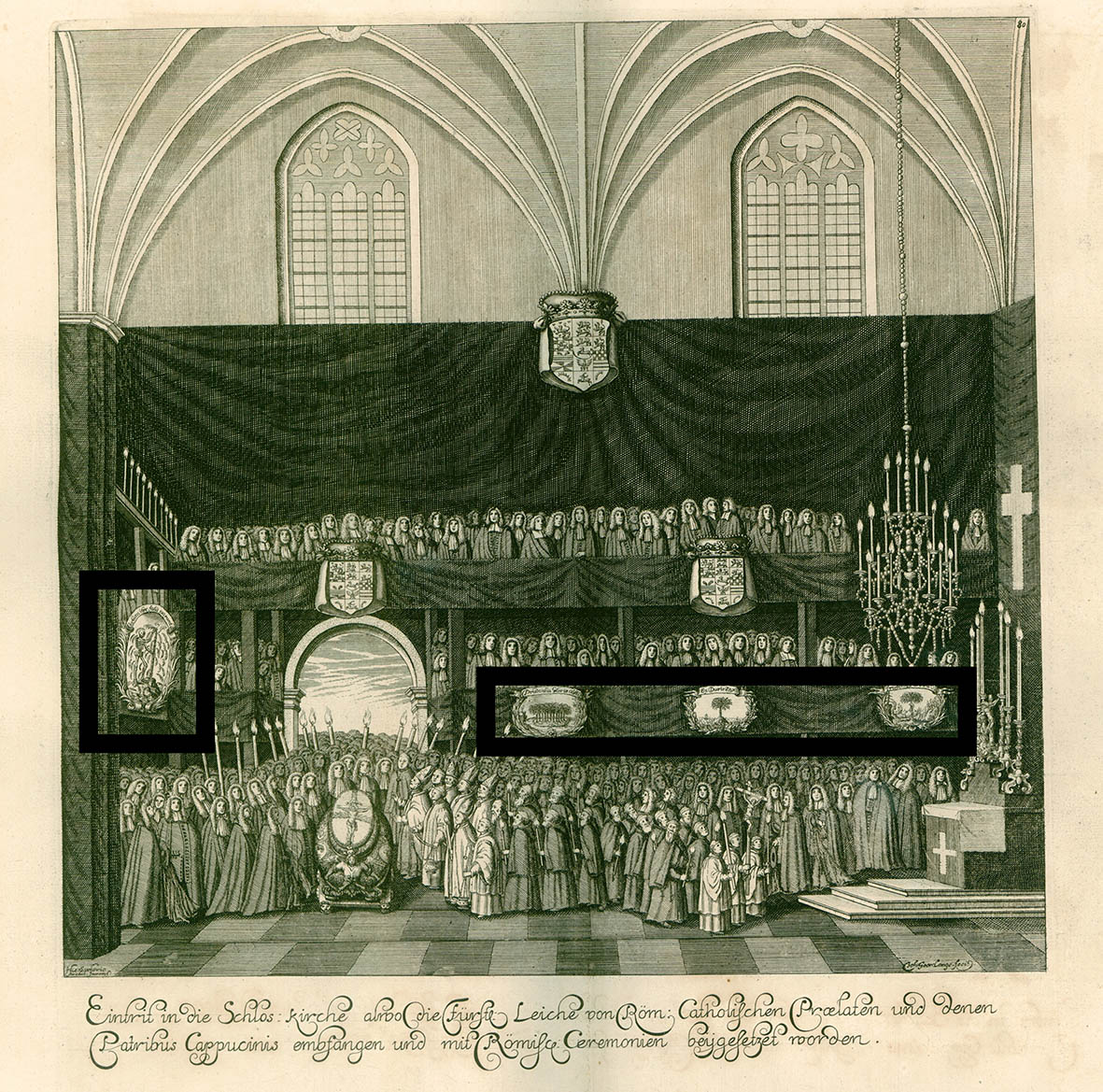 This image shows how Catholic priests and Capuchin monks accompany the coffin into the church together with courtiers. The architectural elements of the church were altered to suit the occasion: the walls were covered with black fabric on which colourful signs with variations of the palm tree emblem can be seen clearly.