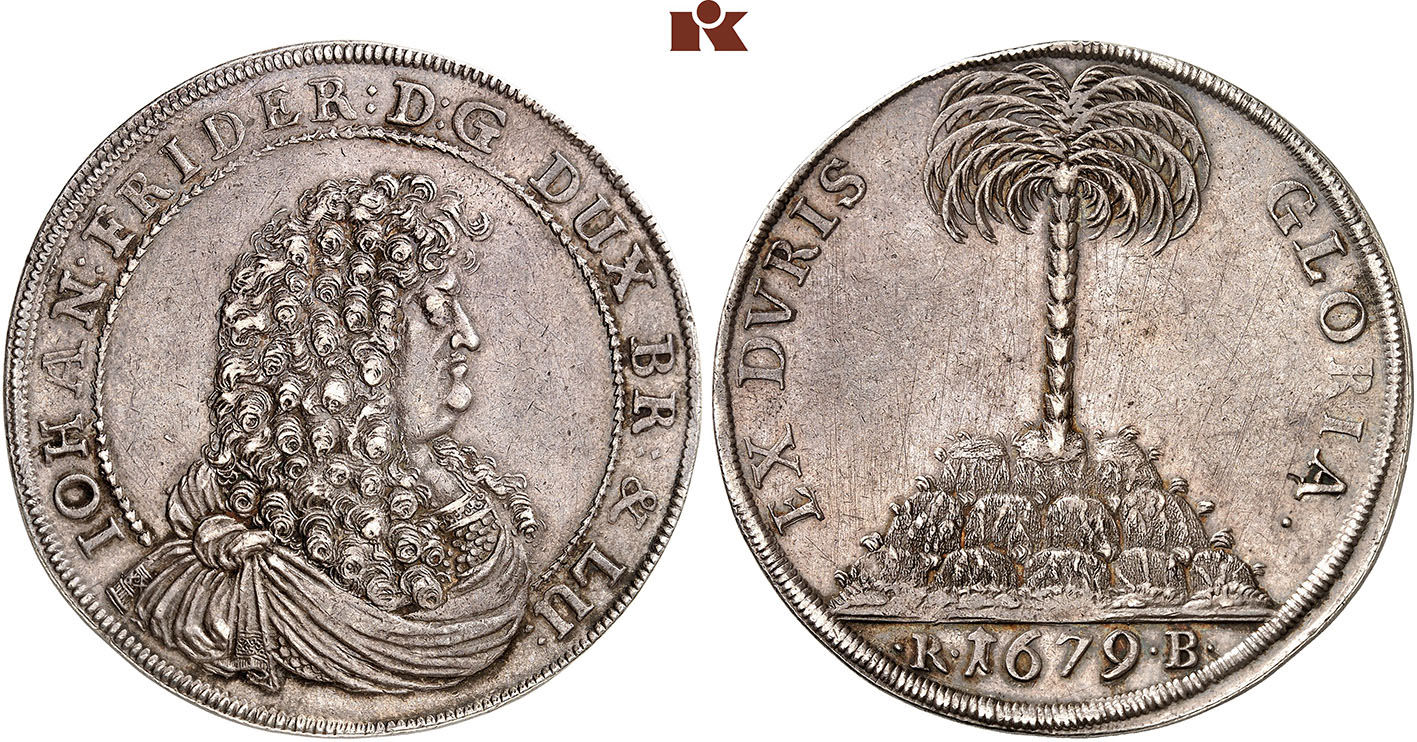 This motto can be found on numerous coins of John Frederick. In a very free translation, it simply means “No pain, no gain”. The palm tree was chosen as a motif because it was considered very difficult to climb it due to the hard, rough bark but its crown was filled with sweet dates.