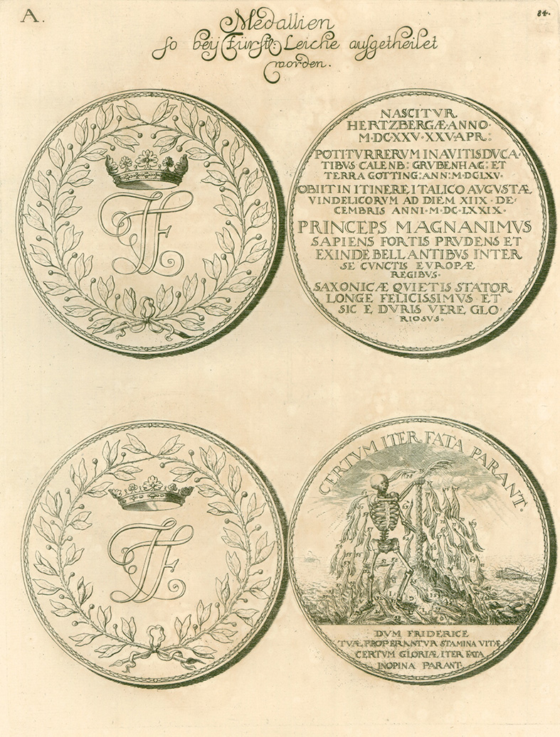 When we stand in front of baroque churches and castles, we only see a fraction of what the architects of this era created. Again and again, elaborate but transient decorations were made for various occasions. One of them can be seen on this plate. It depicts the wooden gate that covered the stone portal of the Hannover castle church during the funeral. For numismatists, the painting at the top of the gate is particularly noteworthy: We see Death as a skeleton felling the palm tree of John Frederick’s emblem. The ships in the background with broken rigging are interesting, too.