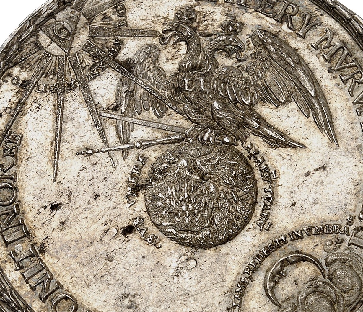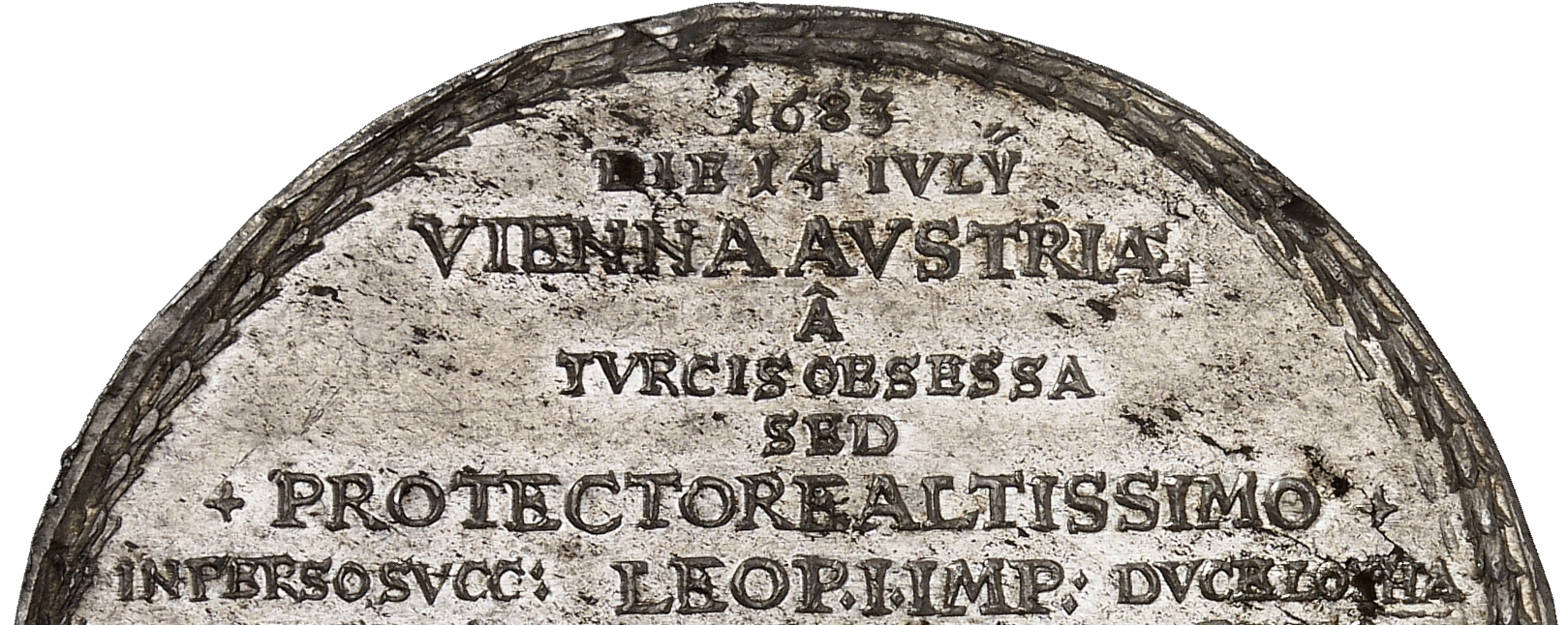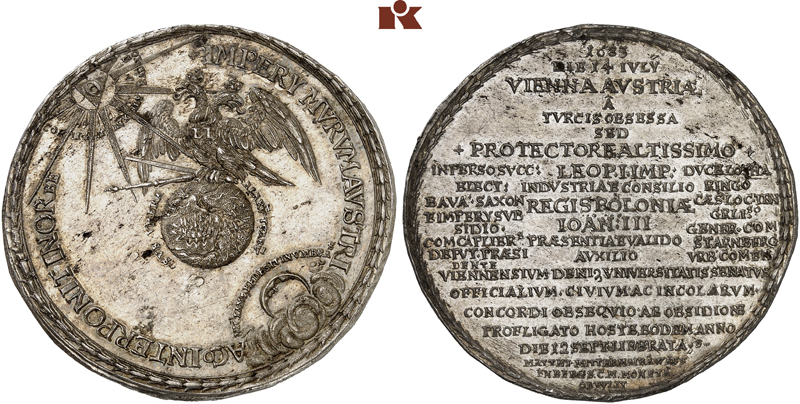 Therefore, the long inscription on the reverse starts with the words: VIENNA AVSTRIAE A TVRCIS OBSESSA – after Austrian Vienna was besieged by the Turks. This word is of utmost importance because Vienna was located at the very border of the empire – but still inside the empire. In this case, and in this case only, the imperial estates would have been obliged to pay taxes for its defence. Pressburg, today’s Bratislava, on the other hand, was only a day’s march from Vienna but was not part of the empire. Therefore, defending Pressburg would actually have been a matter of the Habsburgs only.