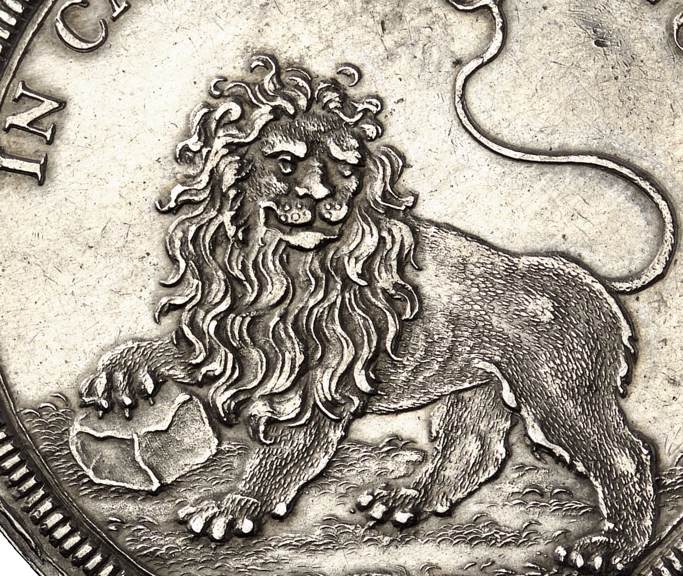 The reverse of the magnificent coin shows a depiction that gives room for several interpretations. For one, let us take it literally: there is a lion holding a stone – quite fitting for the Count of Löwenstein (English. Lionstone). However, we also have to take the motto into account, whose translation reads Always be vigilant. After all, we rather know this pose and the stone in connection with a crane as a symbol of vigilance. The crane was believed to hold a stone in its talon so that – should it fall asleep and drop the stone – it would immediately wake up from the noise. People in the Baroque era loved ambiguous images like these.
