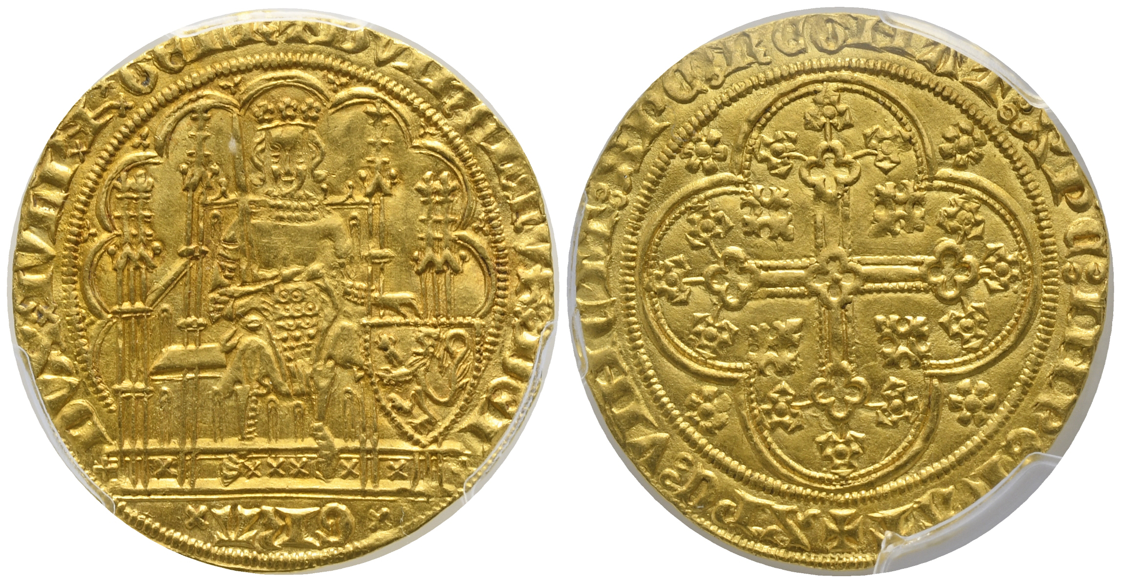 The écu d’or à la chaise struck between 1393 and 1402 portrays William as a wise ruler, sitting on the throne, holding a sword in his hand as a symbol of his power over life and death, the shield with the coat of arms of Jülich in the left hand. We are familiar with this depiction from the “small chaise”, a significantly more frequent coin type that combines this obverse with the design of the Rhenish gold guilder on the reverse. The weight of William’s coin recalls the big écu d’or à la chaise, which had been minted for the first time on behalf of Philip IV of France in 1303. Even though the weight of these coins was reduced to 4.7 g in 1337, they had become relics of the past long before William’s coin was struck.