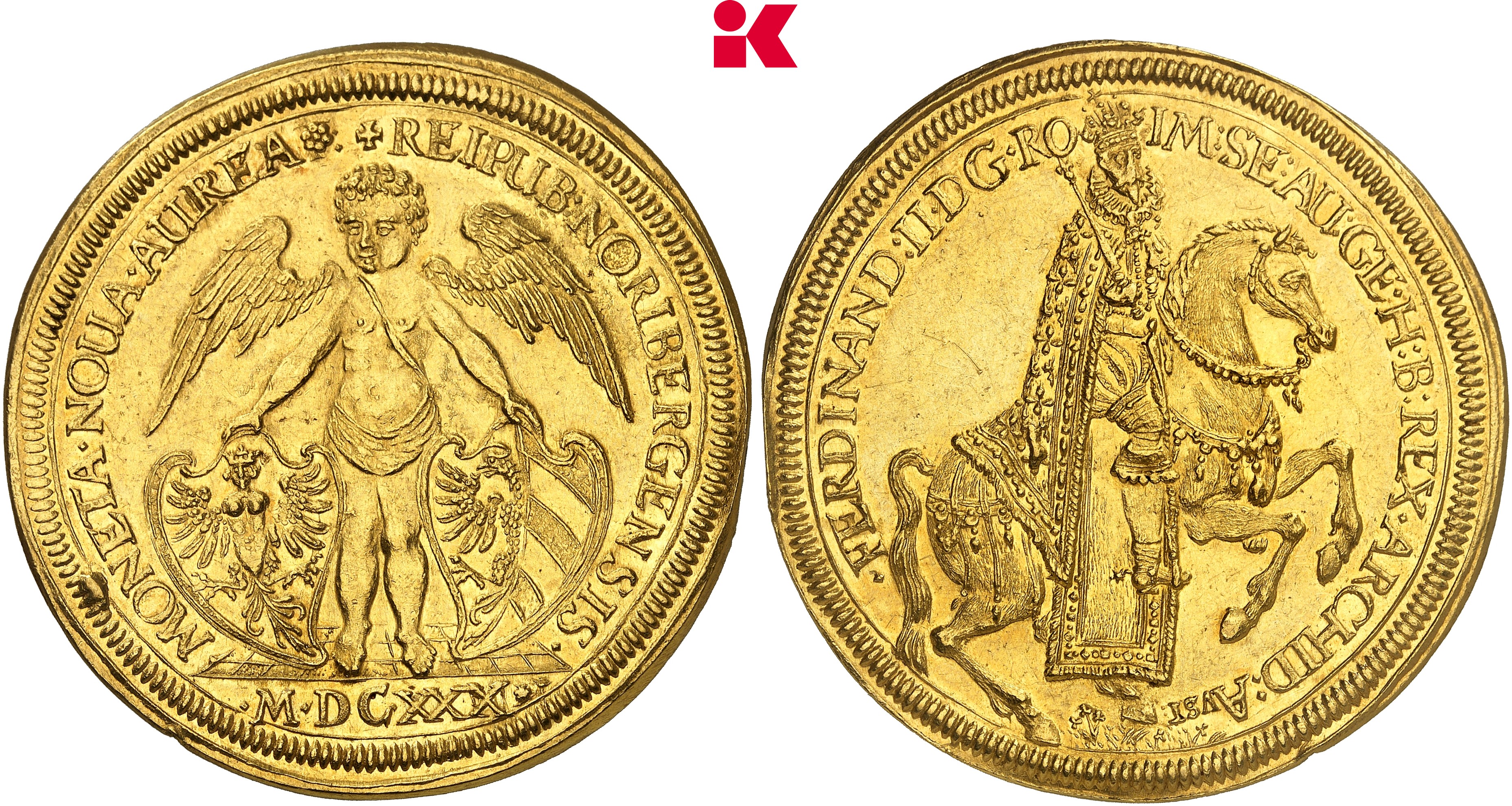By now, it goes without saying that multiple gold coins are extremely popular with numismatic investors. This is proven once again by a 10-ducat coin from Nuremberg, distinguished by its sharp minting quality and its perfect condition. Dating from 1630, the piece is extremely rare. One side shows a winged putto standing frontally and holding the small and the large coats-of-arms of Nuremberg in its hands. The other side is dedicated to Ferdinand II. He is depicted in full regalia, with crown, scepter and coronation cloak, on a rearing horse. 1630 was the year of his greatest power. Wallenstein had just secured him a resounding victory in the Thirty Years’ War, leading the emperor to believe that he could reclaim all the possessions of the Catholic Church via the Edict of Restitution. However, he had overplayed his hand. When Gustavus Adolphus landed in Peenemünde on Usedom on 6 July, the Protestants welcomed "the Lion from the North" as a liberator and the course of the war changed. Künker’s experts had estimated the piece from the Erlanger Collection at 50,000 euros. Their comment stated that this coin had been minted using the modified die of the 1628 double taler. The year was changed to 1630, and the metal specification from ARGENT to AVREA*. The rarity was sold for 140,000 euros plus premium and taxes.