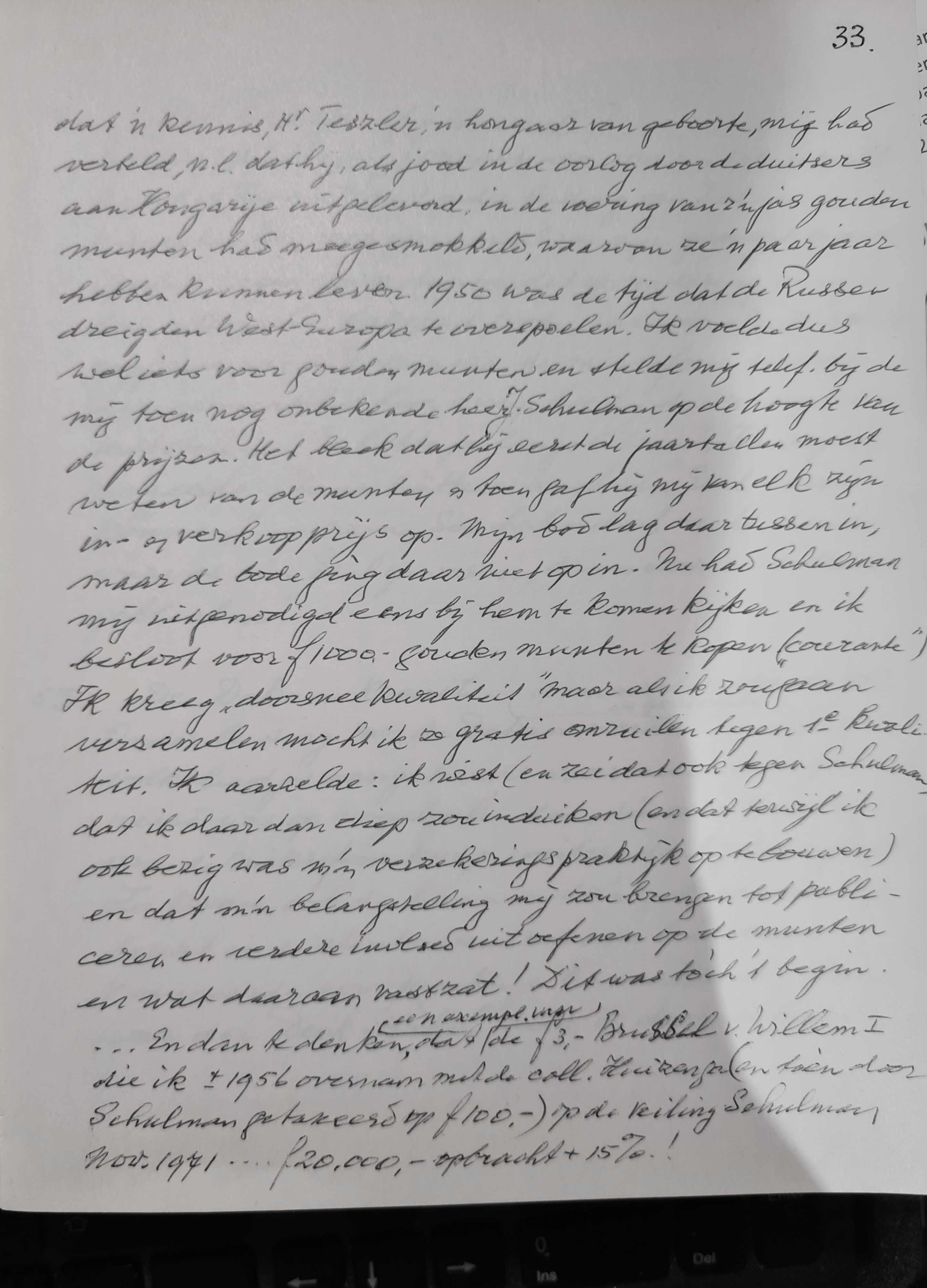 1950 was the time when the Russians were threatening to overrun Western Europe. I did in fact have some gold coins, and I phoned Mr J. Schulman, who was unknown to me at the time, to find out what they were worth. It turned out that he first had to know the dates of the coins, but then he told me the purchase price and the selling price of each coin. My offer was in between, but the courier did not take me up on this offer. Schulman invited me to come visit him; I did so, and decided to buy the gold coins at a price of 1,000 (‘current’). I received items of ‘average quality’, but if I collected them I would supposedly be able to exchange them for the best quality free of charge.