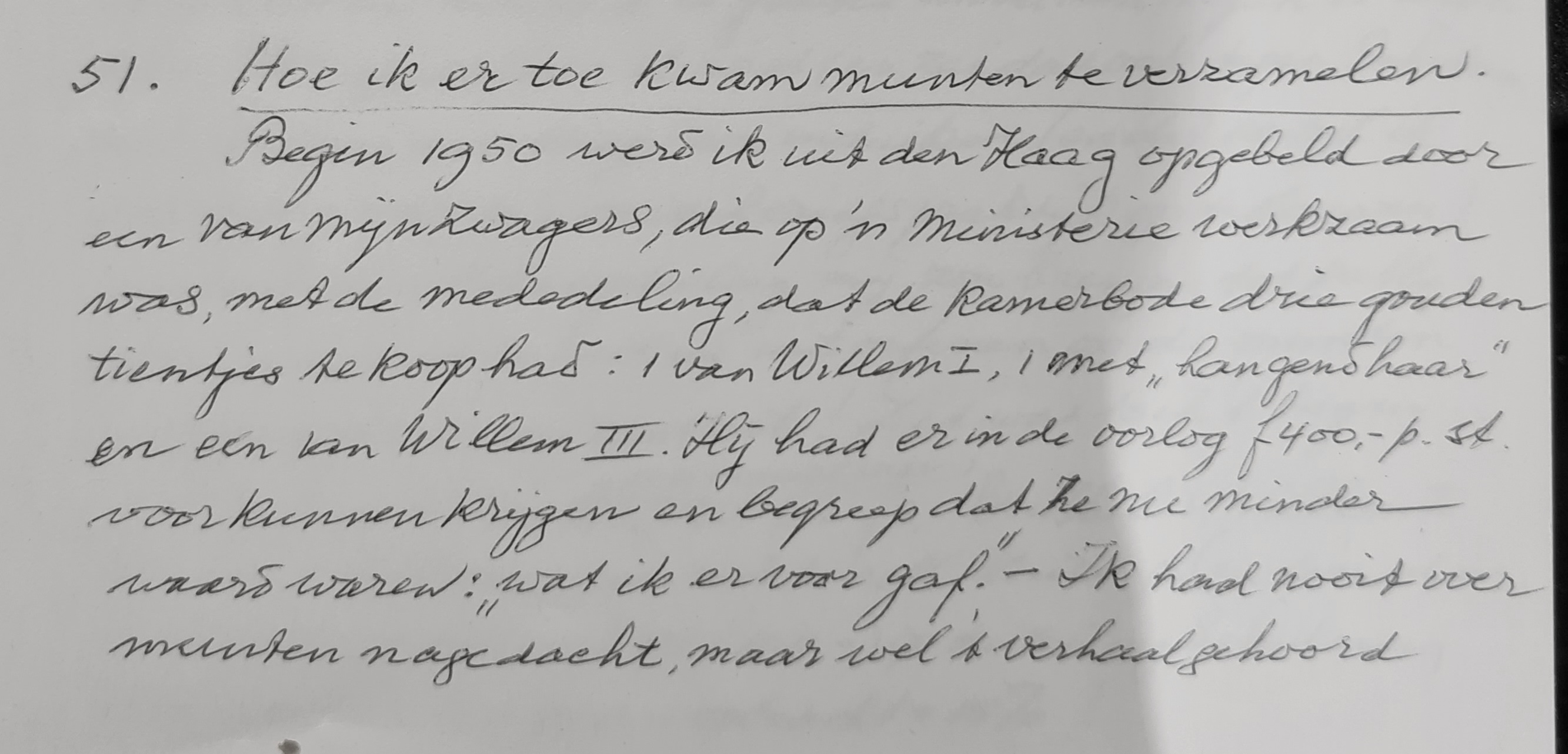 At the beginning of 1950 I received a call from The Hague, from a brother-in-law who worked in a ministry. He told me that the house courier was offering three gold “tens” for sale: one of Willem I, one with “hanging hair”, and one of Willem III. He had been able to get 400 gulden each for them during the war, and he had realized that they were now worth less: namely “what I paid for them”.