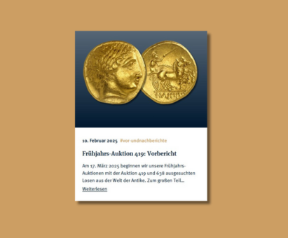 Am 17. März 2025 beginnen wir unsere Frühjahrs-Auktionen mit der Auktion 419 und 638 ausgesuchten Losen aus der Welt der Antike. Zum großen Teil stammen sie aus der Sammlung eines Juristen, der bei all seinen Käufen sorgfältig auf Qualität und Provenienz achtete. Das Resultat: Eine Traumsammlung. Und seine Münzen sind nicht die einzigen mit weit zurückreichenden Pedigrees.