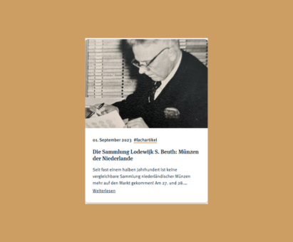 Im Oktober 2023 wurde in Zusammenarbeit mit Laurens Schulman B.V. der erste Teil der Sammlung Lodewijk S. Beuth versteigert. Wir publizierten aus diesem Anlass einen Artikel über die Sammlung, in dem wir einige der interessantesten Münzen aus Auktion 393 vorstellten.