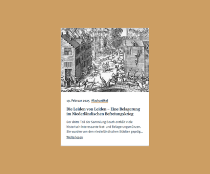 Der dritte Teil der Sammlung Beuth enthielt viele historisch-interessante Not- und Belagerungsmünzen. Sie wurden von den niederländischen Städten geprägt, die während des 80-jährigen Krieges von Spanien belagert wurden. Eine dieser Städte war Leiden, das bis heute jährlich mit einem Fest an das Ende der Belagerung erinnert.
