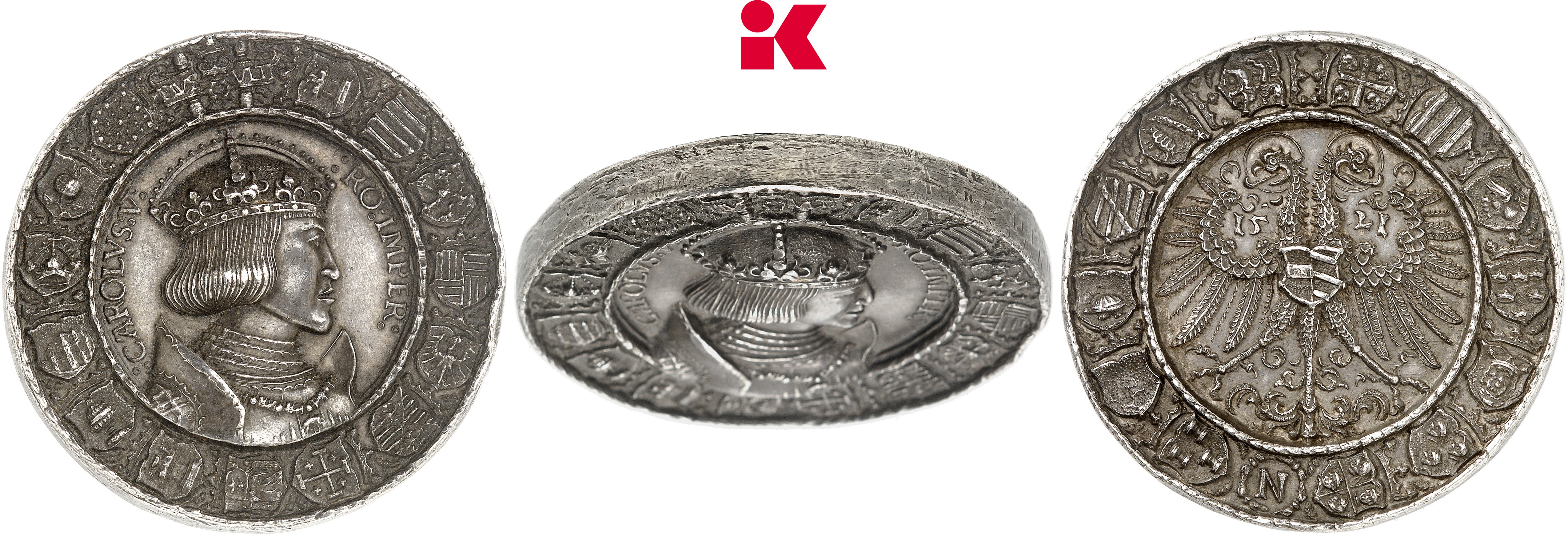 Losnummer 305 ist die einzige Prägung aus Silber, die nicht nur unter den Top Five zu finden ist, sondern unter allen 27 Losen, die ein sechsstelliges Ergebnis in Auktion 418 erzielten. Es handelt sich um eine silberne Medaille aus dem Jahr 1521, die auf der Vorderseite das Porträt Karls V. zeigt. Allein diese Tatsache lässt vermuten, dass es sich bei dem Stück um etwas ganz besonderes handeln muss. In der Tat zeichnete niemand geringerer als der Nürnberger Renaissance-Künstler Albrecht Dürer für ihren Entwurf verantwortlich. Einer der bedeutendsten deutschen Stempelschneider, der Nürnberger Hans Krafft, wurde mit der Ausführung dieser technisch anspruchsvollen Prägung betraut. Wie einmalig seine Leistung war, illustriert sein Lohn. Normale Stempel wurden mit zwei bis fünf Gulden vergütet. Für diese Prägung erhielt er rund das Dreißigfache: 150 Gulden! Die Nürnberger Stadtväter waren großzügig. Schließlich waren die Stücke für niemanden anderes bestimmt als für Kaiser Karl V. höchstpersönlich. Ihm wollte man damit ein eindrucksvolles Zeugnis für die Kunstfertigkeit des städtischen Handwerks überreichen. Wir wissen, dass der Stadtrat 167 Exemplare der Medaille prägen ließ. Doch da der Reichstag ausfiel, bei dem sie überreicht werden sollten, wurden sie fast alle wieder eingeschmolzen. Heute kennen wir nur noch dreizehn Originale, von denen neun in einem Museum liegen. Dass ein Liebhaber bei so viel Geschichte bereit war, 250.000 Euro zu bieten, darf deshalb nicht verwundern. Damit kam diese beeindruckende Renaissance-Medaille auf Platz 2 der Top Five.