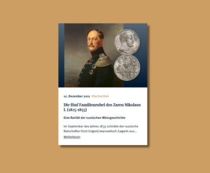 Eine Familiengeschichte der besonderen Art wird aufgeblättert: In unserer Auktion 203 am 2. Februar 2012 in Berlin durften wir alle(!) fünf Varianten des Familienrubels von Zar Nikolaus I. präsentieren. Ein absolutes Novum.