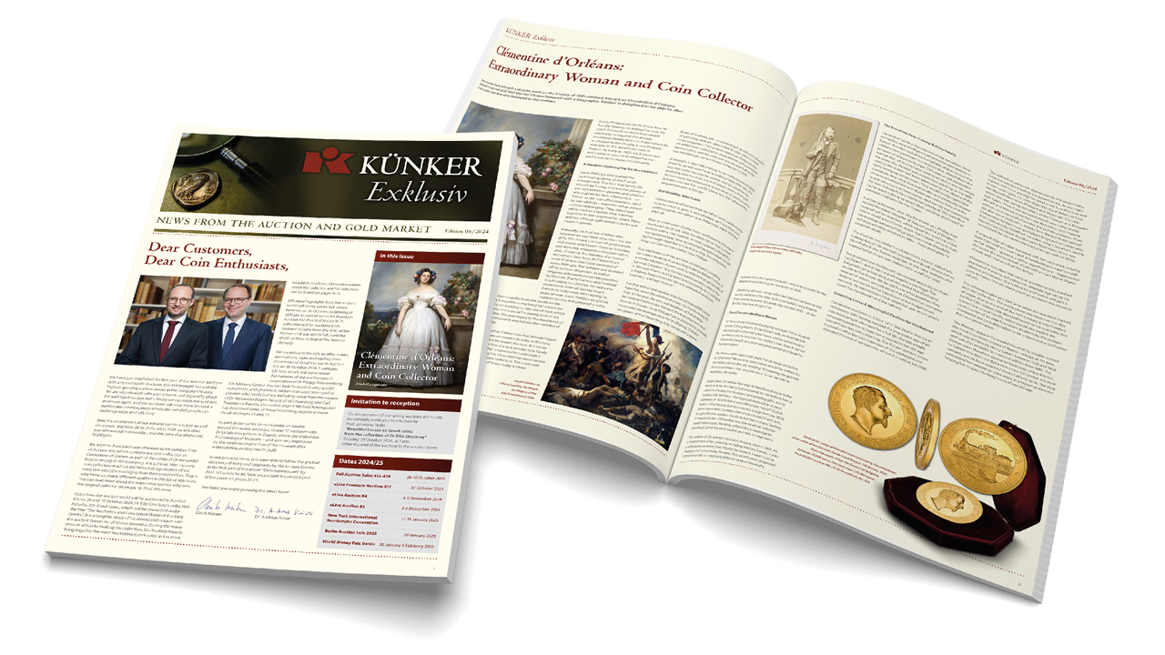 In der neuesten Ausgabe unseres Magazins "Künker Exklusiv" dreht sich alles um unsere Ordens- und Antiken-Auktion, die im Rahmen des zweiten Teils unserer Herbst-Auktionen vom 28.-31. Oktober 2024 stattfanden. Wir berichten ausführlich über ausgewählte Objekte der Auktion 415 mit Orden, Ehrenzeichen, Münzen und Medaillen aus Nachlässen herzoglicher Häuser sowie über die Sammlung von Dr. Eike Druckrey mit griechischen Münzen aus der Welt der Antike.