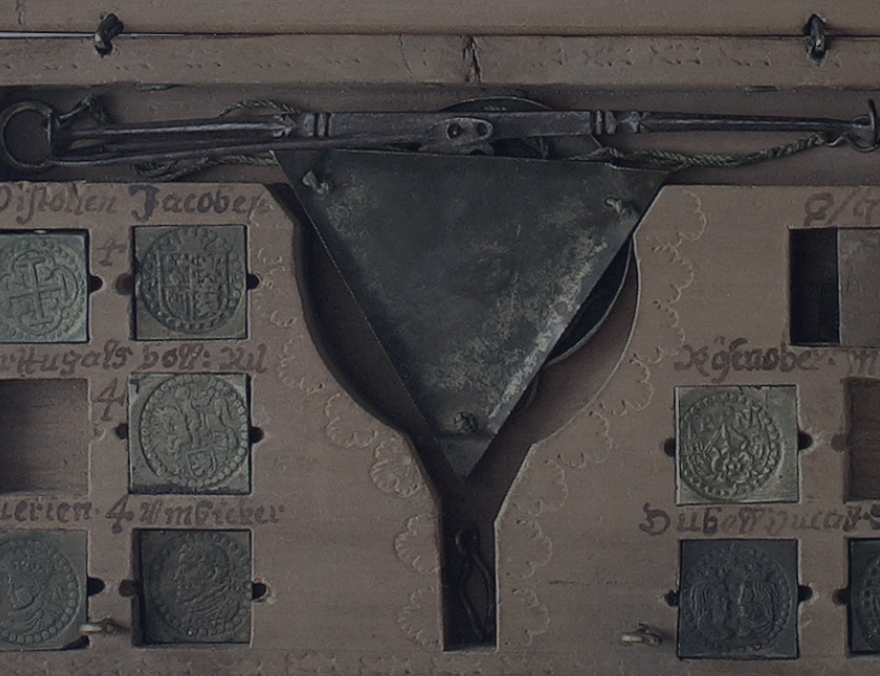 Speziell gefertigte Münzwaagen wurden zu allen Zeiten zum Prüfen von Münzen auf Vollgewichtigkeit und Echtheit benutzt. Im Mittelalter dienten vor allem leicht zusammenlegbare Klappwaagen zum Abwiegen von Münzen und Edelmetall („Hacksilber“), da die Menge der geprägten Sorten nahezu unüberschaubar war. Seit dem 16. Jahrhundert wurden die aus einem Waagebalken, Waagschalen und Gewichten bestehenden Sets der Münzwaagen zumeist in gut transportierbaren und dekorativen Holzkästen aufbewahrt. Die enthaltenen Gewichte lauteten dabei nicht auf eine bestimmte Maßeinheit wie Gramm oder Unze, sondern auf die entsprechenden Münznominale: Dukat, Taler oder Noble. Die Bestimmung der zu wiegenden Münzsorte erfolgte bei der Münzwaage entweder über die Schriftangabe auf dem Gewicht (bspw. 1 LsDOR = 1 Louis d’or oder 1 GOLD GULD = 1 Goldgulden) oder das darauf eingeprägte Bild der Münze. Zur Unterscheidung von den originalen Zahlungsmitteln waren die Gewichte der Münzwaagen dabei meist rechteckig und bestanden aus Messing.