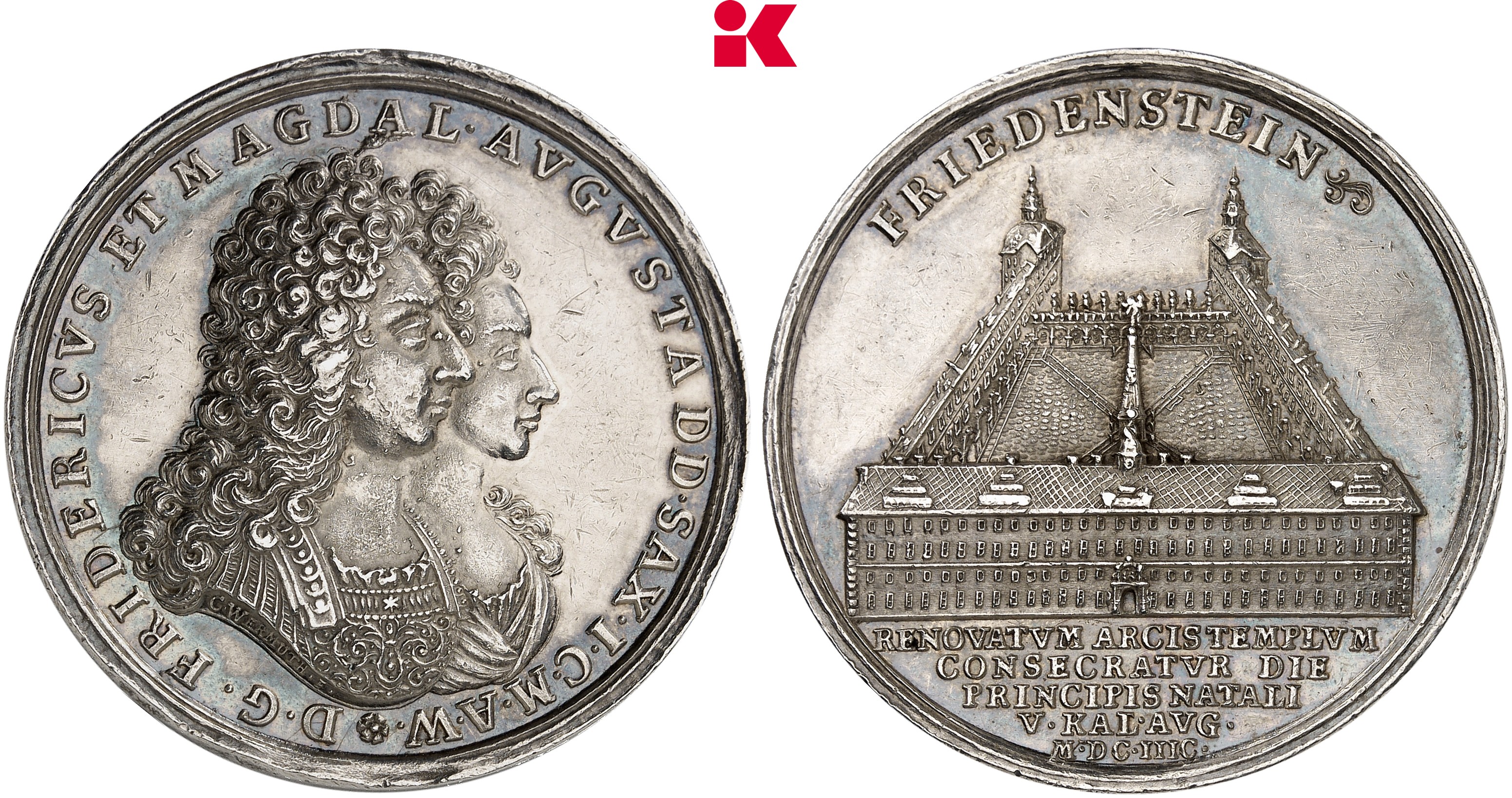 Ebenfalls von Wermuth stammt eine Barockmedaille von 1697 auf die Einweihung der St. Trinitatiskirche auf Schloss Friedenstein als Draufsicht mit einem Obelisken in der Mitte des Schlosshofes von Stadtseite her. Zuerst nahm man an, dieser wurde aus Symmetriegründen in die Medaille eingefügt. Mittlerweile ist bekannt, dass es ihn wirklich gab, allerdings musste er nach gut einem Jahr wegen Baufälligkeit abgerissen werden. (Los 4517). Für den Sammler ein Beleg dafür, dass solche Kleinodien dokumentarische Qualität besaßen und so zu Recht nicht in der Kunstkammer, sondern als Zeitdokumente in der Bibliothek aufbewahrt wurden. Für die Aufbewahrung „seiner Schätze“ baute Friedrich II. von Sachsen Gotha-Altenburg in die Bibliothek 1713 ein Münzkabinett ein. Das historische Münzkabinett gilt heute als eine einzigartige Barockeinrichtung.