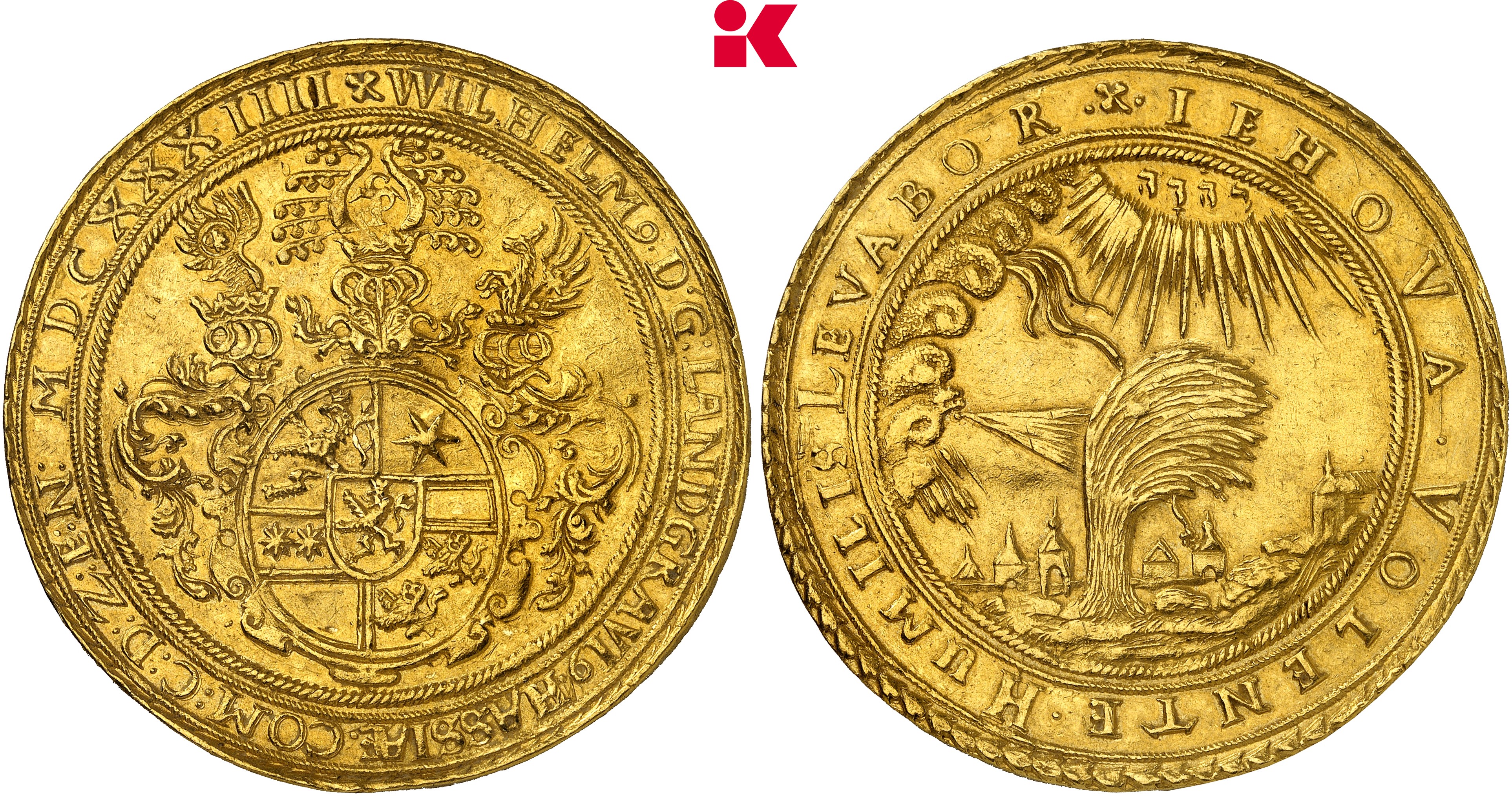 Wilhelm V. wollte seine Sicht der Dinge unter möglichst vielen Menschen verbreiten. Deshalb kennen wir Weidenbaumprägungen in vielen Nominalen: Als Taler, Mehrfachtaler und Talerteilstücke, als Dukaten, Mehrfachdukaten und Gulden. Das 10 Dukatenstück, das am 29. Januar 2025 in unserer Auktion 418 angeboten wird, war unediert, ehe es erstmals für unsere Auktion 279 vom 23. Juni 2016 katalogisiert wurde. Inzwischen findet man diese Goldmünze im „Friedberg“, aber es handelt sich immer noch um das einzige bekannte Exemplar in Privathand.